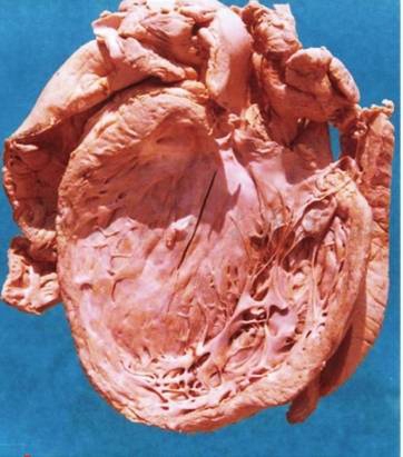 (心脏高度扩大,室壁普遍变薄,乳头肌肉柱变扁,重 443g)