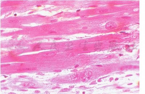 心肌纤维肿胀,横纹模糊不清,肌原纤维断续,其间出现多数微细颗粒。病变严重时,肌纤维内出现排列较整齐的肌原纤维收缩带,心肌收缩带宽窄不一,肌原纤维断裂,呈粗糙的颗粒状结构,可发展为心肌凝固性坏死。