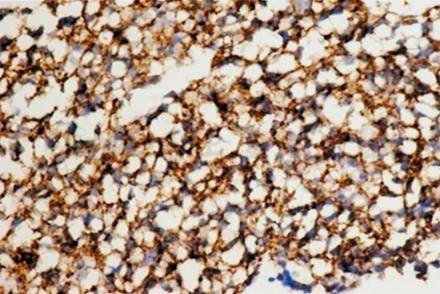 图5 骨髓穿刺组织标本免疫组化检查,瘤细胞CD138表达阳性IHC×400