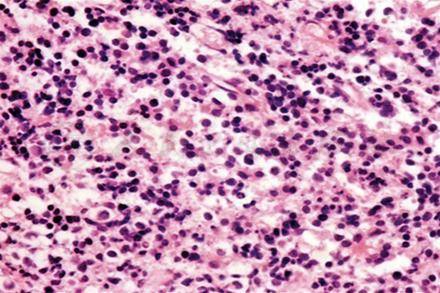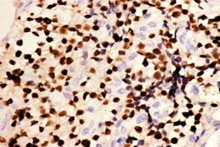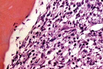 有时需用PCR技术来帮助诊断,特别困难的病例需骨髓穿刺,其标本再进行组织病理学(图4)和免疫组织化学检查(图5),明确诊断。