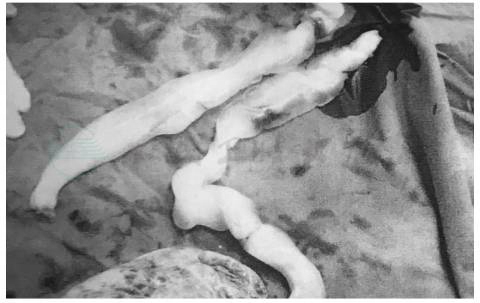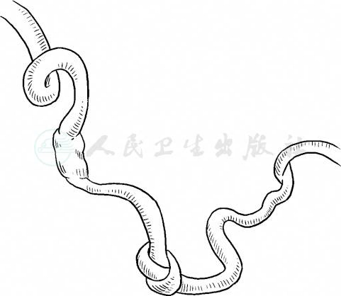 脐带打结(knot of umbilical cord)有真结、假结之分,脐带假结实质上只是因为脐血管长度不一致或血管与脐带长度不一致,局部卷曲形成外观似“打结”的结构,一般不会对母儿有不良影响。脐带真结是在中孕期胎儿位置不固定,脐带绕躯干时,胎儿在宫内活动穿过脐带环形成真正的结(图3),也有同时存在2~3个真结的情况。一般真结都合并有脐带较长的情况,当脐带松弛,血循环不受影响。但孕晚期随着胎儿入盆,特别是临产后胎儿下降,就可能导致真结被拉紧,脐带血流受阻甚至断流,就会出现胎心改变或胎儿死亡。脐带真结是孕晚期和产程中胎儿猝死的主要原因。遗憾的是目前对脐带真结还缺乏可靠的产前确诊的方法,几乎都是在胎儿娩出后诊断。
