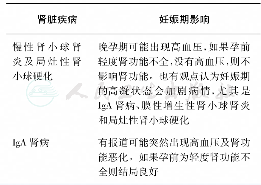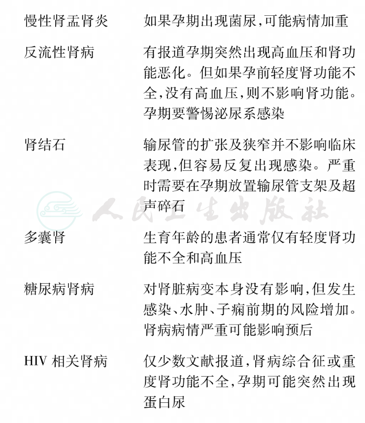 所以,合并CKD的女性应该在孕前了解一般状况是否满意、其肾脏原发病的病理结果,CKD原发病的种类也影响妊娠结局,如狼疮肾病、膜性增生性肾小球肾炎等孕期容易加重,硬皮病、结节性动脉炎累及肾脏伴有高血压的患者应该建议不要怀孕。并在孕前调整各种用药,使用孕期安全的药物维持舒张压≤80mmHg。肌酐水平应该低于2. 8mg/dl(250μmol/L),尽量低于2. 0mg/dl(180μmol/L),如果不超过1.4mg/dl(125μmol/L)最佳。没有或仅有轻度蛋白尿,并且糖尿病、感染等并发症控制良好,还要回顾既往生育史。综合上述信息考虑是否适合妊娠或者继续妊娠。各种肾脏疾病对妊娠的影响见表1。