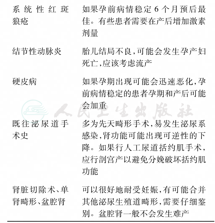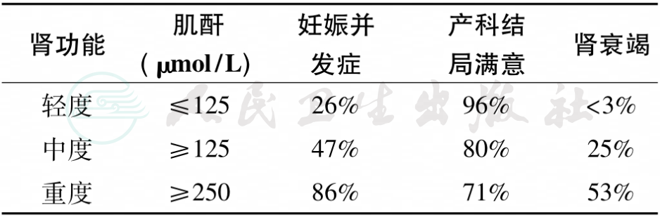1.通过24小时肌酐清除率和24小时尿蛋白定量来评价肾功能。①如果在孕期发现肾功能恶化,要考虑是否存在泌尿系感染(UTI)、轻度脱水、电解质紊乱等可逆性因素并解除诱因,如果为没有原因的肾功能恶化则要考虑终止妊娠。②如果出现并持续有蛋白尿,如果血压正常、肾功能正常,可严密监测下继续妊娠。③如果出现肾功能的急剧恶化、肌酐超过20mmol/L和/或难治性高钾血症、严重的代谢性酸中毒、肺水肿、心力衰竭、利尿剂治疗无效时,可以行紧急透析。透析主要为了促胎儿成熟延长时间,并不能延缓肾功能的恶化,在透析之前要与患者及家属反复讨论,充分告知风险。④因为肾病综合征有血栓形成的倾向,可以考虑预防性应用低分子肝素抗凝,持续到产后6周。
