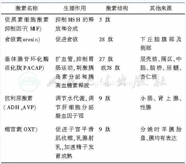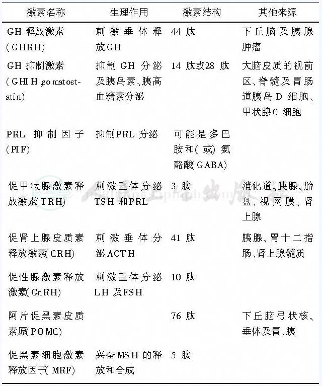 下丘脑分泌的激素或因子包括释放激素(或因子)和抑制激素(或因子),种类较多,具体的激素名称和生理功能见表1。