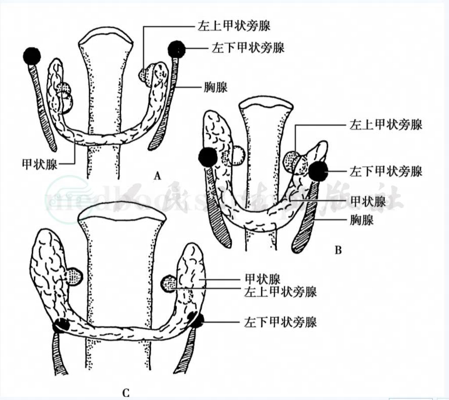 甲状旁腺由第3及第4对咽囊背侧的上皮细胞发育而成。在胚胎第7周,甲状旁腺的原基即逐渐与咽囊分离,并向尾侧移动;第8周,原基细胞团渐次分化,形成腺体;人胚第15周时,第3对咽囊的背翼上皮分化成下甲状旁腺组织,而其腹翼形成胸腺。自第3对咽囊形成的1对甲状旁腺向下移动较远,在形成下甲状旁腺的过程中与胸腺的发生有密切联系。即来源于咽囊腹翼的胸腺,在下降时常将下甲状旁腺牵拉至甲状腺后缘。在下甲状旁腺和胸腺向尾端下降过程中,甲状旁腺一般与胸腺分离,而位于甲状腺下极后方附近,即位于颈胸腺残余组织(甲状胸腺韧带)的上方、齐平或其中。