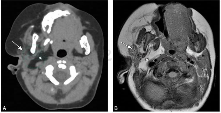 A.脑CT轴位像;B.脑MRI的T1WI像。可见右侧腮腺和咀嚼肌(箭头)脂肪瘤浸润及相应的大理石纹,以及右侧咽旁间隙扩张(星号)