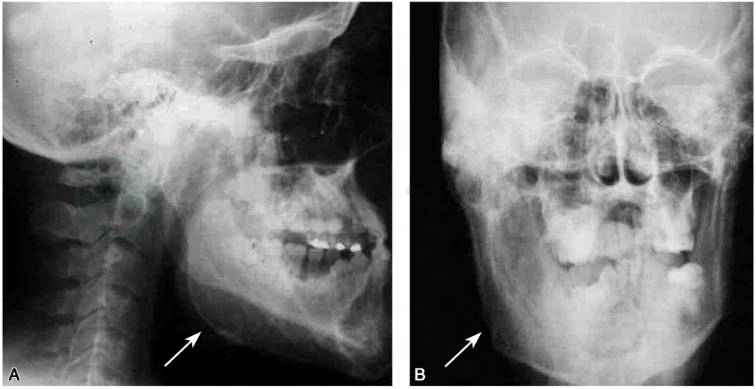 A.头颅和下颌骨侧位像,显示右髁、冠状突和下颌体明显的骨性增大;B.前后位像,箭头显示下颌骨畸形区