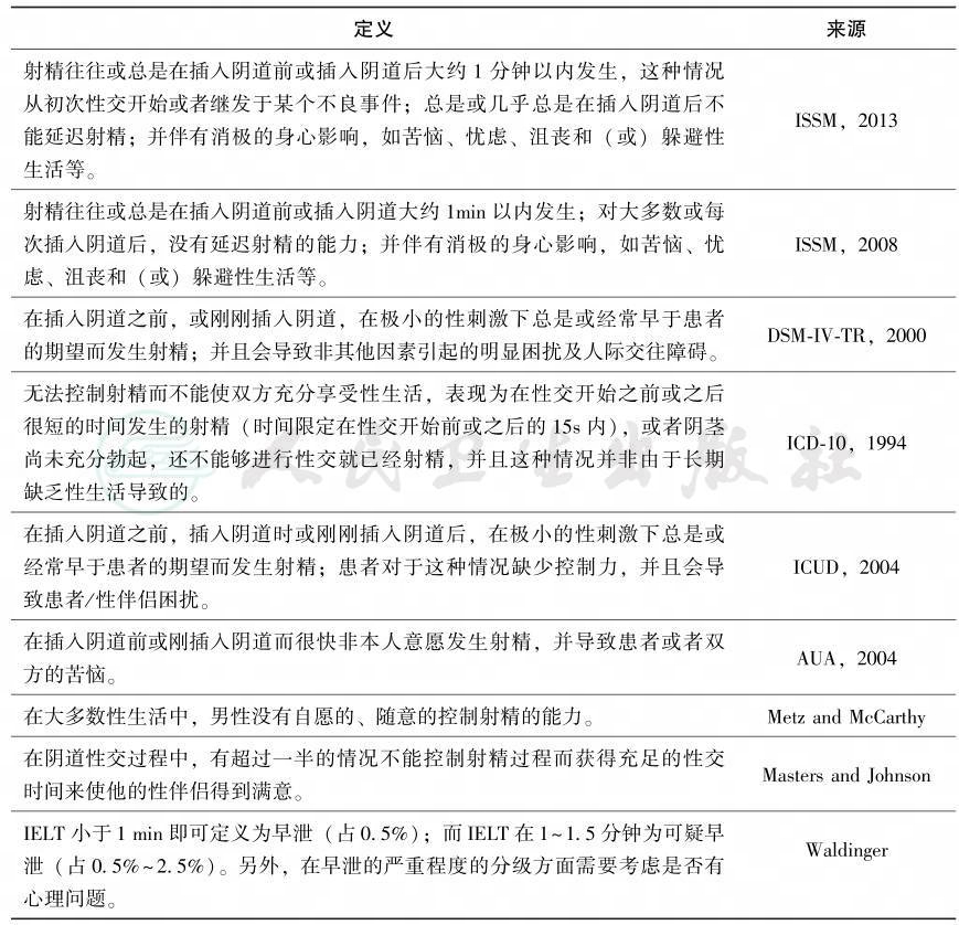 自1943年Schapiro第一次提出早泄的概念以来,对于早泄的定义一直存在争议[3]。不同的学术组织或个人对早泄的定义也不尽相同(表3-2)[4-12]。虽然早泄的定义尚未达成共识,但均包含了三个主要因素:较短的射精潜伏时间,缺乏射精的控制能力,以及由上述两方面对患者和(或)性伴侣造成的困扰和人际交往障碍。