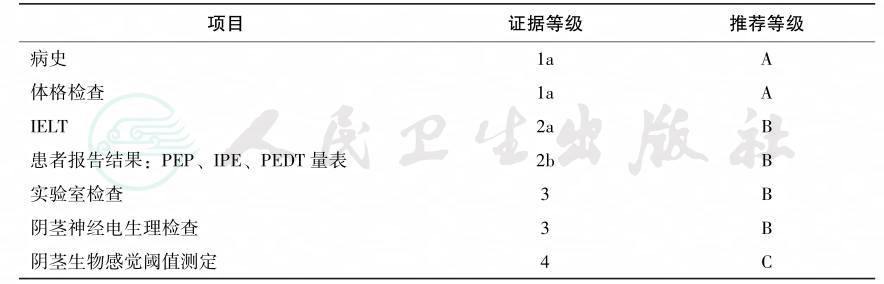 PE的诊断主要依据病史和性生活史[44,45]。详细询问病史可以区分原发性、继发性、变异性和主观性PE。询问内容应包括:阴道内射精潜伏时间(IELT)、PE发生的时间(从第一次性生活开始一直都PE或某个时间点后出现PE)和是否为境遇性(在某种特定环境下和(或)某一特定伴侣)。此外,还应注意射精的控制力、双方的满意度、性刺激程度、对性活动和QoL的影响、药物的使用和滥用的情况以及区分PE和ED,许多ED患者由于对勃起的获得和维持的焦虑可引起PE现象[46]。