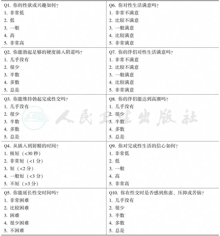 为了客观的评估PE,多种基于患者报告结果的问卷被设计出来[52]。目前常用的有三种量表,分别是早泄简表(The Premature Ejaculation Profile,PEP)、早泄指数(The Index of Premature Ejaculation,IPE)、早泄诊断工具(Premature Ejaculation Diagnostic Tool, PEDT)[53,54](见附录)。这三种量表中,PEDT是使用最广泛的量表。姜辉等在国内开展的多中心流行病学调查,用PEDT量表作为诊断工具,研究发现中国人群PE的发病率33.1%,验证了该量表在国人中的适用性、高敏感度和一致性。进一步推广了该量表在国内的普及应用[55]。
