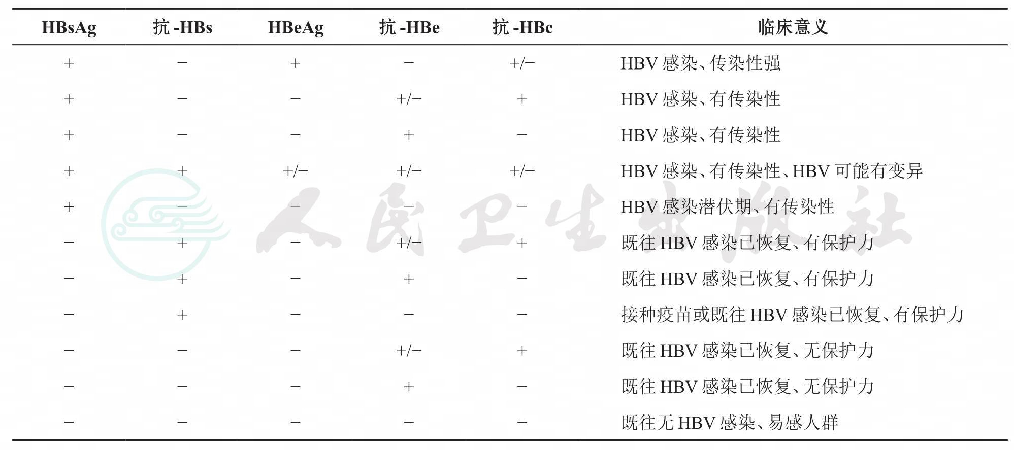 检测乙型肝炎血清学标志物,即HBsAg、乙型肝炎表面抗体(抗-HBs)、HBeAg、乙型肝炎e抗体(抗-HBe)以及乙型肝炎核心抗体(抗-HBc),可判断有无感染或有无免疫力,其临床诊断的意义见表1。