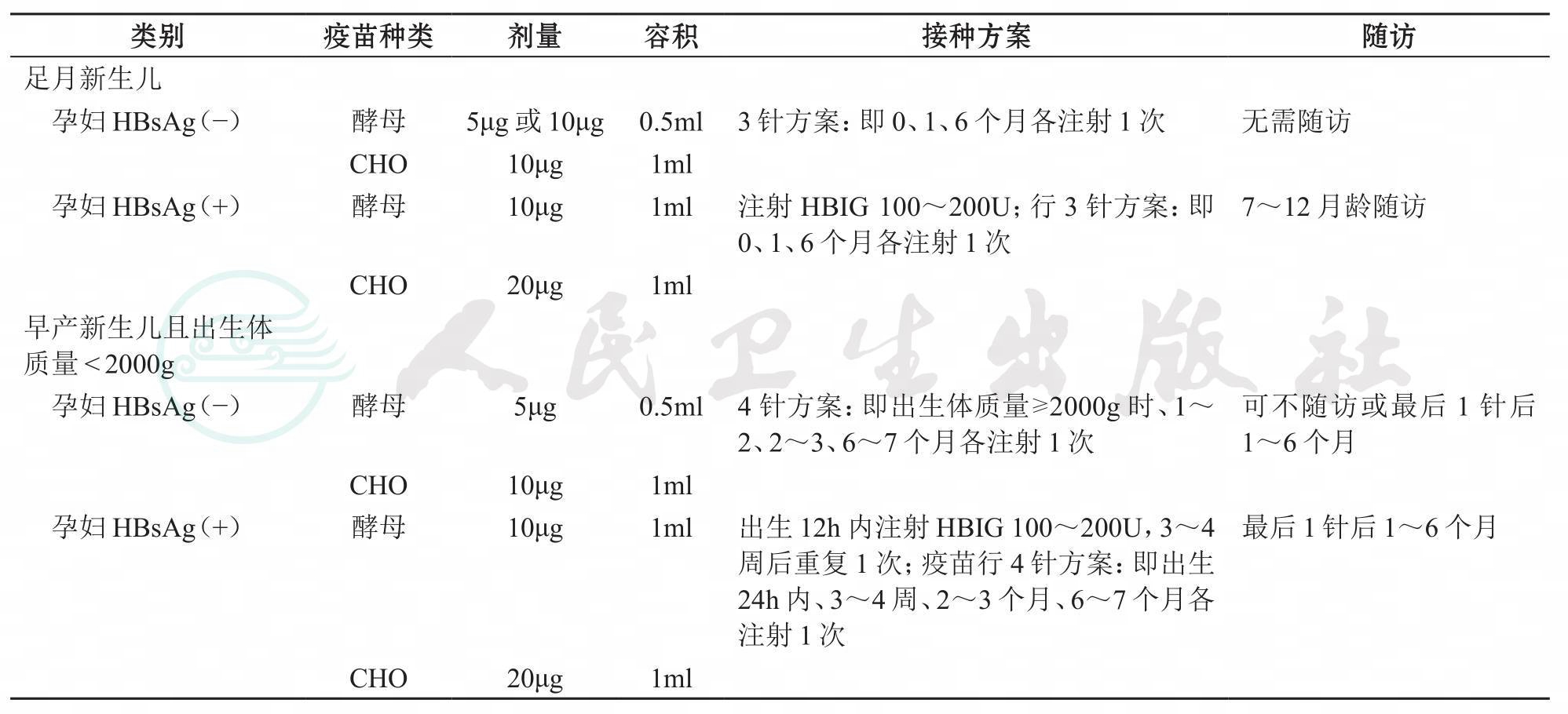 孕妇HBsAg阴性时,无论HBV相关抗体如何,新生儿按“0、1、6个月”方案接种疫苗,不必使用HBIG。见表2。