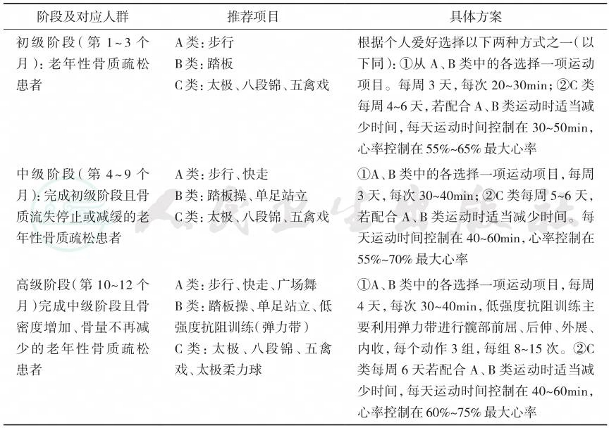 | 初级阶段(第 1~3个 月):老年性骨质疏松 患者 A类:步行 B类:踏板 C类:太极、八段锦、五禽戏 根据个人爱好选择以下两种方式之一(以 下同):①从A、B类中的各选择一项运动 项目。每周3天,每次20~30min;②C类 每周4~6天,若配合A、B类运动时适当减 少时间,每天运动时间控制在30~50min, 心率控制在55%~65%最大心率 中级阶段(第 4~9个 月):完成初级阶段且骨 质流失停止或减缓的老 年性骨质疏松患者 A类:步行、快走 B类:踏板操、单足站立 C类:太极、八段锦、五禽戏 ①A、B类中的各选择一项运动项目,每周 3天,每次30~40min;②C类每周5~6天, 若配合A、B类运动时适当减少时间。每 天运动时间控制在40~60min,心率控制在 55%~70%最大心率 高级阶段(第10~12个 月)完成中级阶段且骨 密度增加、骨量不再减 少的老年性骨质疏松 患者 A类:步行、快走、广场舞 B类:踏板操、单足站立、低 强度抗阻训练(弹力带) C类:太极、八段锦、五禽 戏、太极柔力球 ①A、B类中的各选择一项运动项目,每周 4天,每次30~40min,低强度抗阻训练主 要利用弹力带进行髋部前屈、后伸、外展、 内收,每个动作3组,每组8~15次。②C 类每周6天若配合A、B类运动时适当减 少时间,每天运动时间控制在40~60min, 心率控制在60%~75%最大心率 |
