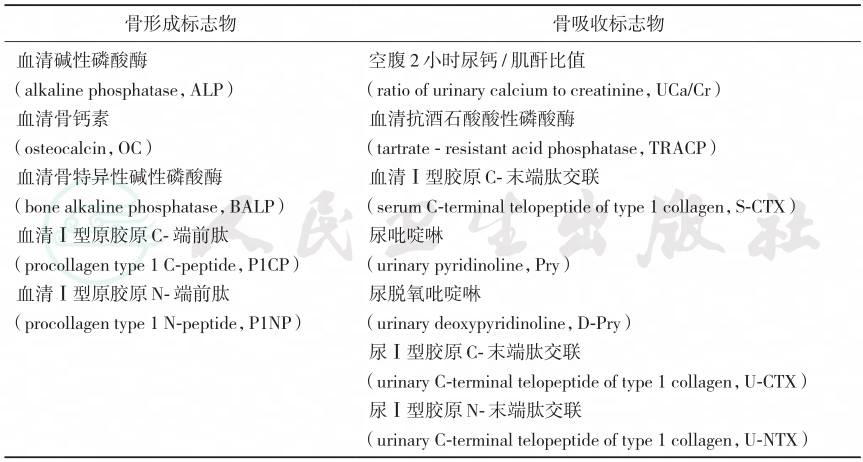 | 血清碱性磷酸酶 (alkaline phosphatase,ALP) 血清骨钙素 (osteocalcin,OC) 血清骨特异性碱性磷酸酶 (bone alkaline phosphatase,BALP) 血清Ⅰ型原胶原C-端前肽 (procollagen type 1 C-peptide,P1CP) 血清Ⅰ型原胶原N-端前肽 (procollagen type 1 N-peptide,P1NP) 空腹2小时尿钙/肌酐比值 (ratio of urinary calcium to creatinine,UCa/Cr) 血清抗酒石酸酸性磷酸酶 (tartrate - resistant acid phosphatase,TRACP) 血清Ⅰ型胶原C-末端肽交联 (serum C-terminal telopeptide of type 1 collagen,S-CTX) 尿吡啶啉 (urinary pyridinoline,Pry) 尿脱氧吡啶啉 (urinary deoxypyridinoline,D-Pry) 尿Ⅰ型胶原C-末端肽交联 (urinary C-terminal telopeptide of type 1 collagen,U-CTX) 尿Ⅰ型胶原N-末端肽交联 (urinary C-terminal telopeptide of type 1 collagen,U-NTX) |