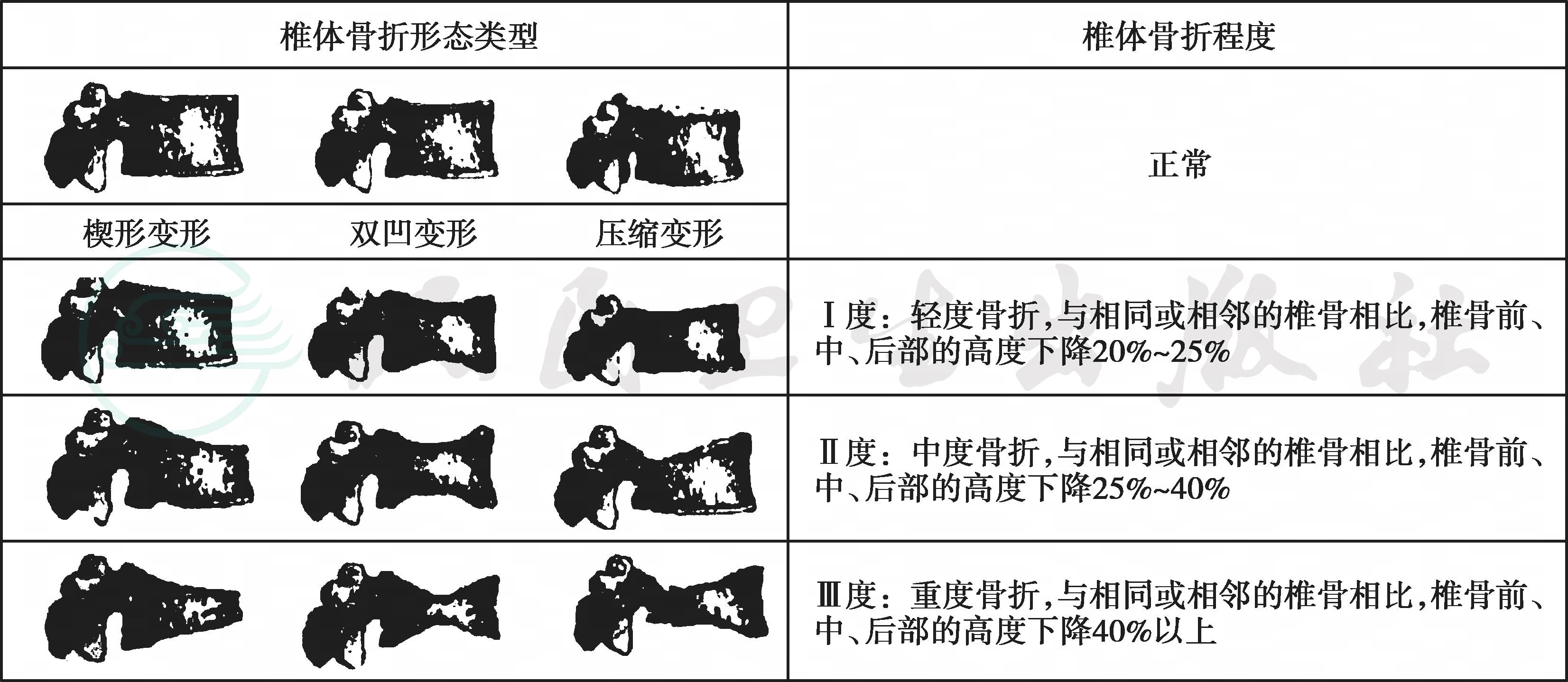 椎体骨折常因无明显临床症状被漏诊,需要在骨质疏松性骨折的危险人群中开展椎体骨折的筛查。胸腰椎X线侧位影像可作为判定骨质疏松性椎体压缩性骨折首选的检查方法。常规胸腰椎X线侧位摄片的范围应分别包括胸4(T4)至腰1(L1)和胸12(T12)至腰5(L5)椎体。基于胸腰椎侧位X线影像并采用Genant目视半定量判定方法(图6-3-2),椎体压缩性骨折的程度可以分为Ⅰ、Ⅱ、Ⅲ度或称轻、中、重度。该判定方法分度是依据压缩椎体最明显处的上下高度与同一椎体后高之比;若全椎体压缩,则压缩最明显处的上下高度与其邻近上一椎体后高之比;椎体压缩性骨折的轻、中、重度判定标准分别为椎体压缩20%~25%、25%~40%及40%以上。