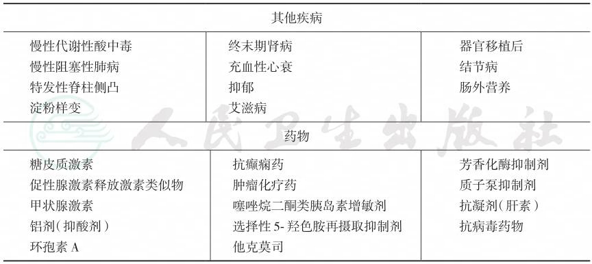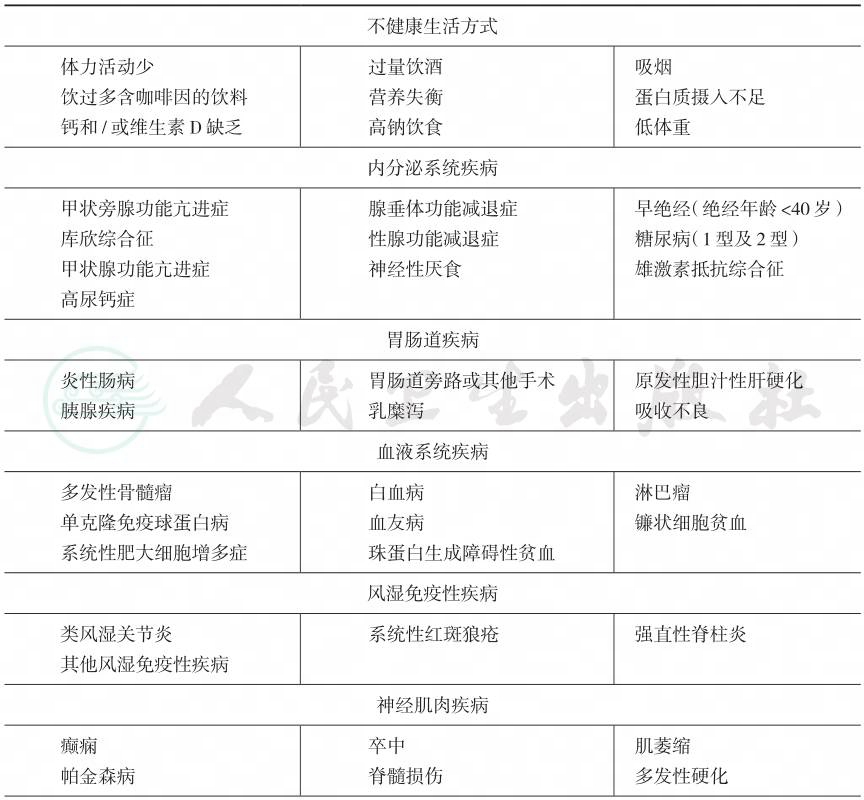 骨质疏松可由多种病因所致。在诊断原发性骨质疏松症之前,一定要重视和排除其他影响骨代谢的疾病,以免发生漏诊或误诊。需详细了解病史,评定可能导致骨质疏松症的各种病因、危险因素及药物,特别强调部分导致继发性骨质疏松症的疾病可能缺少特异的症状和体征,有赖于进一步辅助检查。需要鉴别的病因主要包括:影响骨代谢的内分泌疾病(甲状旁腺疾病、性腺疾病、肾上腺疾病和甲状腺疾病等),类风湿关节炎等免疫性疾病,影响钙和维生素D吸收和代谢的消化系统和肾脏疾病,神经肌肉疾病,多发性骨髓瘤等恶性疾病,多种先天和获得性骨代谢异常疾病,长期服用糖皮质激素或其他影响骨代谢药物等。