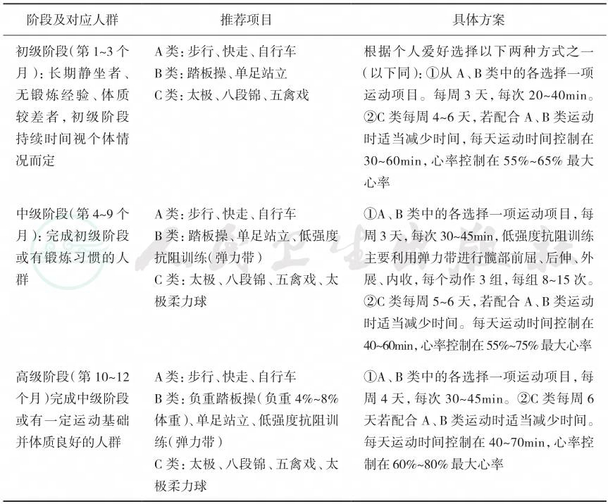 | 初级阶段(第1~3个 月):长期静坐者、 无锻炼经验、体质 较差者,初级阶段 持续时间视个体情 况而定 A类:步行、快走、自行车 B类:踏板操、单足站立 C类:太极、八段锦、五禽戏 根据个人爱好选择以下两种方式之一 (以下同):①从A、B类中的各选择一项 运动项目。每周3天,每次20~40min。 ②C类每周4~6天,若配合A、B类运动 时适当减少时间,每天运动时间控制在 30~60min,心率控制在55%~65%最大 心率 中级阶段(第4~9个 月):完成初级阶段 或有锻炼习惯的人 群 A类:步行、快走、自行车 B类:踏板操、单足站立、低强度 抗阻训练(弹力带) C类:太极、八段锦、五禽戏、太 极柔力球 ①A、B类中的各选择一项运动项目,每 周3天,每次30~45min,低强度抗阻训练 主要利用弹力带进行髋部前屈、后伸、外 展、内收,每个动作3组,每组8~15次。 ②C类每周5~6天,若配合A、B类运动 时适当减少时间。每天运动时间控制在 40~60min,心率控制在55%~75%最大心率 高级阶段(第10~12 个月)完成中级阶段 或有一定运动基础 并体质良好的人群 A类:步行、快走、自行车 B类:负重踏板操(负重4%~8% 体重)、单足站立、低强度抗阻训 练(弹力带) C类:太极、八段锦、五禽戏、太 极柔力球 ①A、B类中的各选择一项运动项目,每 周4天,每次30~45min。②C类每周6 天若配合A、B类运动时适当减少时间。 每天运动时间控制在40~70min,心率控 制在60%~80%最大心率 |