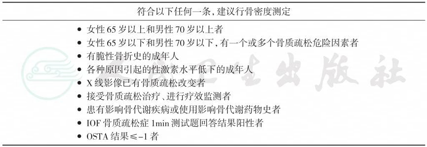 我国已经将骨密度检测项目纳入40岁以上人群常规体检内容,临床上为诊治骨质疏松症的骨密度测定指征见表6-3-1。