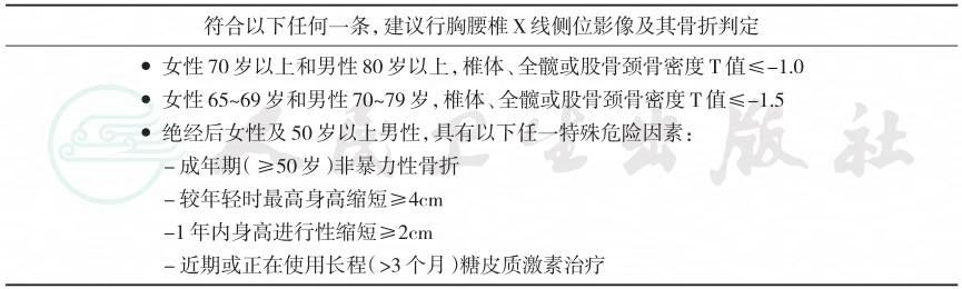 | ● 女性70岁以上和男性80岁以上,椎体、全髋或股骨颈骨密度T值≤-1.0 ● 女性65~69岁和男性70~79岁,椎体、全髋或股骨颈骨密度T值≤-1.5 ● 绝经后女性及50岁以上男性,具有以下任一特殊危险因素: -成年期(≥50岁)非暴力性骨折 -较年轻时最高身高缩短≥4cm -1年内身高进行性缩短≥2cm -近期或正在使用长程(>3个月)糖皮质激素治疗 |