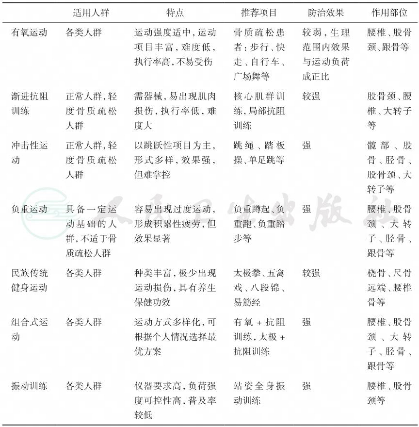 | 有氧运动 各类人群 运动强度适中,运动 项目丰富,难度低, 执行率高,不易受伤 骨质疏松患 者:步行、快 走、自行车、 广场舞等 较弱,生理 范围内效果 与运动负荷 成正比 腰椎、股骨 颈、跟骨等 渐进抗阻 训练 正常人群,轻 度骨质疏松 人群 需器械,易出现肌肉 损伤,执行率低,难 度大 核心肌群训 练,局部抗阻 训练 较强 股骨颈、腰 椎、大转子 等 冲击性运 动 正常人群,轻 度骨质疏松 人群 以跳跃性项目为主, 形式多样,效果强, 但难掌控 跳绳、踏板 操、单足跳等 强 髋部、股 骨、胫骨、 股骨颈、大 转子等 负重运动 具备一定运 动基础的人 群,不适于骨 质疏松人群 容易出现过度运动, 形成积累性疲劳,但 效果显著 负重蹲起、负 重跑、负重踏 步等 强 腰椎、股骨 颈、大转 子、胫骨、 跟骨等 民族传统 健身运动 各类人群 种类丰富,极少出现 运动损伤,具有养生 保健功效 太极拳、五禽 戏、八段锦、 易筋经 较强 桡骨、尺骨 远端、腰椎 骨等 组合式运 动 各类人群 运动方式多样化,可 根据个人情况选择最 优方案 有氧+抗阻 训练,太极+ 抗阻训练 强 腰椎、股骨 颈、大转 子、胫骨、 跟骨等 振动训练 各类人群 仪器要求高,负荷强 度可控性高,普及率 较低 站姿全身振 动训练 强 腰椎、股骨 颈等 |