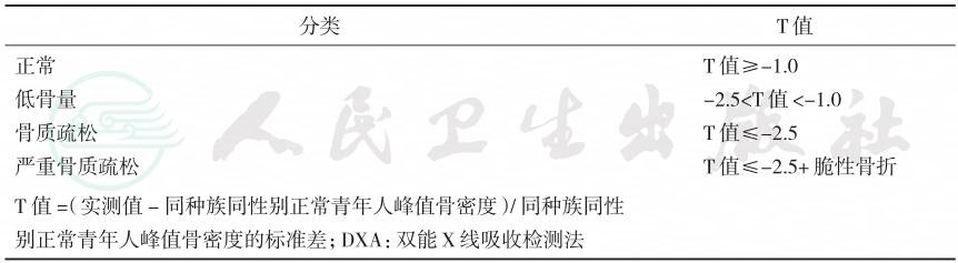 | 正常 低骨量 骨质疏松 严重骨质疏松 T值≥-1.0 -2.5<T值<-1.0 T值≤-2.5 T值≤-2.5+脆性骨折 T值=(实测值-同种族同性别正常青年人峰值骨密度)/同种族同性 别正常青年人峰值骨密度的标准差;DXA:双能X线吸收检测法 |