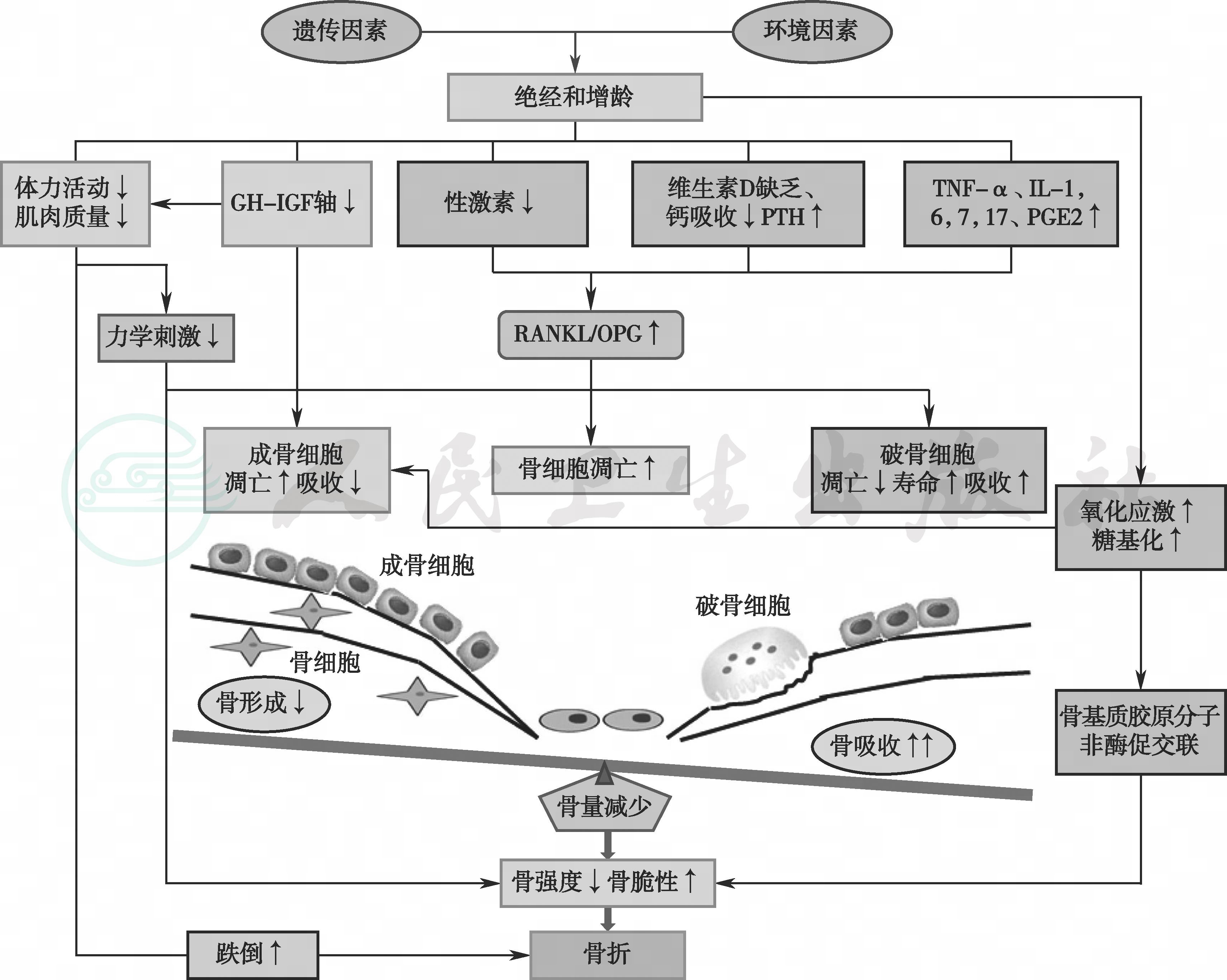 老年性骨质疏松症一方面由于增龄造成骨重建失衡,骨吸收/骨形成比值升高,导致进行性骨丢失;另一方面,增龄和雌激素缺乏使免疫系统持续低度活化,处于促炎性反应状态。刺激破骨细胞,并抑制成骨细胞,造成骨量减少。雌激素和雄激素在体内均具有对抗氧化应激的作用,老年人性激素结合球蛋白持续增加,使睾酮和雌二醇的生物利用度下降,体内的活性氧类(reactive oxidative species,ROS)堆积,促使间充质干细胞、成骨细胞和骨细胞凋亡,使骨形成减少。老年人常见维生素D缺乏及慢性负钙平衡,导致继发性甲状旁腺功能亢进。年龄相关的肾上腺源性雄激素生成减少、生长激素-胰岛素样生长因子轴功能下降、肌少症和体力活动减少造成骨骼负荷减少,也会使骨吸收增加。此外,随增龄和生活方式相关疾病引起的氧化应激及糖基化增加,使骨基质中的胶原分子发生非酶促交联,也会导致骨强度降低。