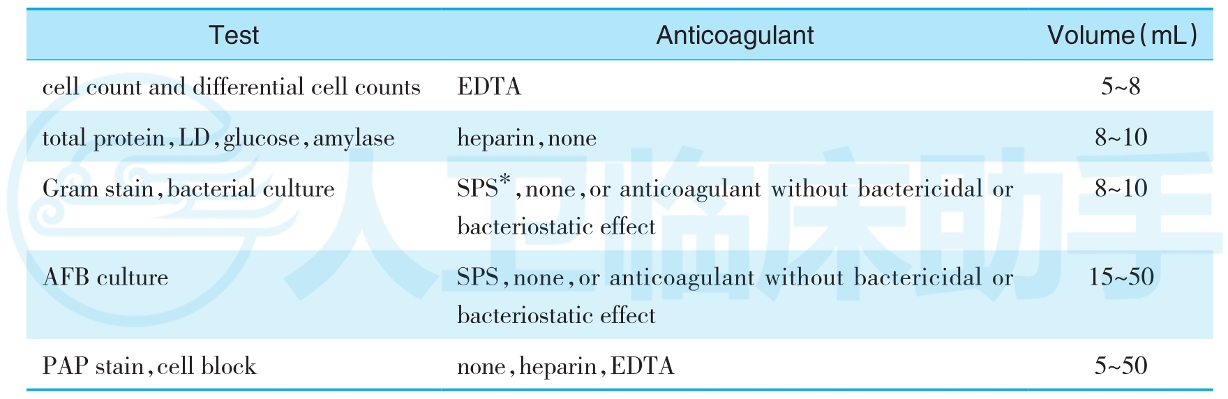 Tab. 2-3 Specimen requirements for serous fluids