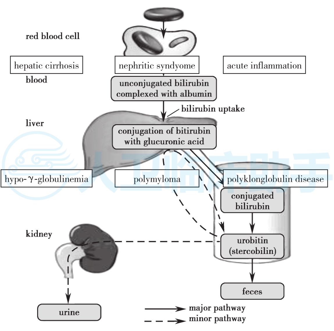 由于肝脏损伤,肝细胞对胆红素的摄取、转化和排泄清除能力下降所致。表现为血液中UCB和CB增高,尿液中URO亦升高。