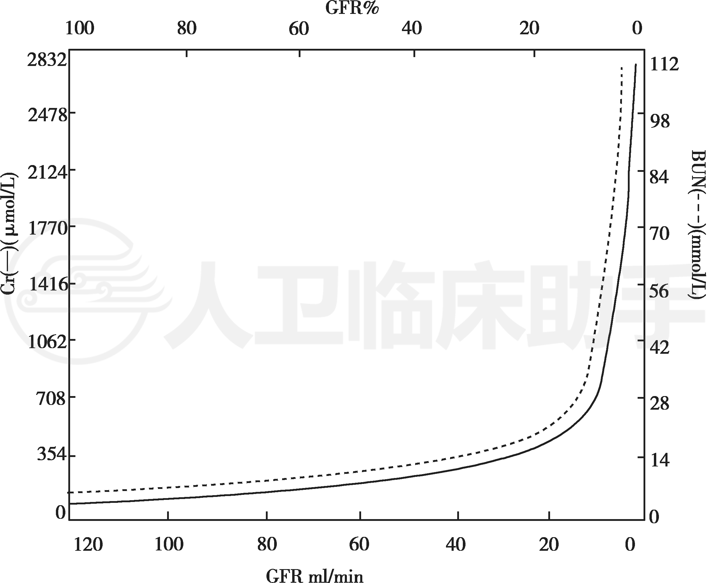 Fig. 10-1 Relationship between the glomerular filtration rate(GFR) and the levels of serum creatinine (Cr) and blood urea nitrogen(BUN)