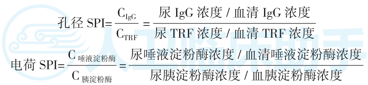 肾小球滤过膜具有一定“选择性”。滤过膜的“选择性”与滤过膜各层的孔隙大小相关,分子越大的物质越难通过。还与滤过膜所带电荷有关,正常时滤过膜表面覆盖一层带负电荷的蛋白多糖,使带负电荷的较大分子不易通过。由于肾小球滤过膜受损害的程度不同,尿中不同相对分子质量的各种蛋白质的比例有差异,因此提出尿蛋白选择性来评估滤过膜的受损程度。常用选择性尿蛋白指数来表示,测定患者血清和尿中相对分子质量差异较大的免疫球蛋白G (immunoglobulin G,IgG分子质量150kD)和转铁蛋白(transferrin,TRF,分子质量70kD),分别计算各自的清除率及孔径SPI(即二者清除率的比值);同时检测分子量相近的但所带电荷不同的胰型和唾液型淀粉酶同工酶,计算各自的清除率及电荷SPI(为二者清除率的比值)。计算公式如下:
